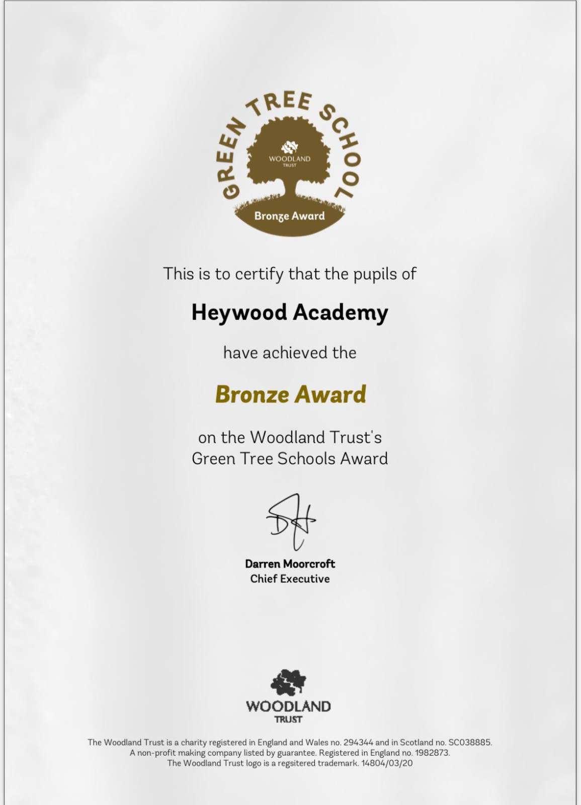 Heywood Academy is proud to announce that we have achieved our first ever award — the Bronze Award from the Woodland Trust’s Green Tree Schools Award!